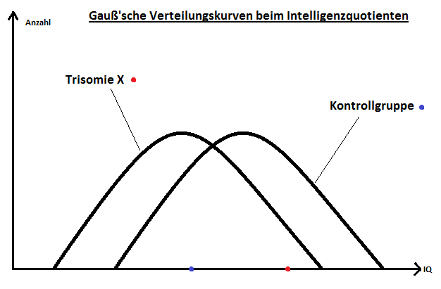 Beide Verteilungen überlappen sich in einem großen Bereich, d.h., auch ein Trisomie-X-Mädchen (roter Punkt) kann einen höheren IQ aufweisen als ein 46,XX-Mädchen (blauer Punkt). Ein Durchschnitts-IQ von 80-90 alleine sagt nichts aus.